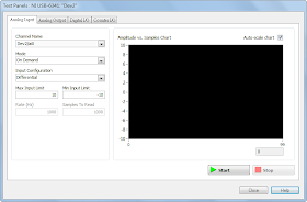 首先看到的是 Analog Input 畫面,也就是類比輸入的畫面,介面上可以選擇擷取的通道、擷取的方式、資料輸入的模式、以及其他硬體的設定。